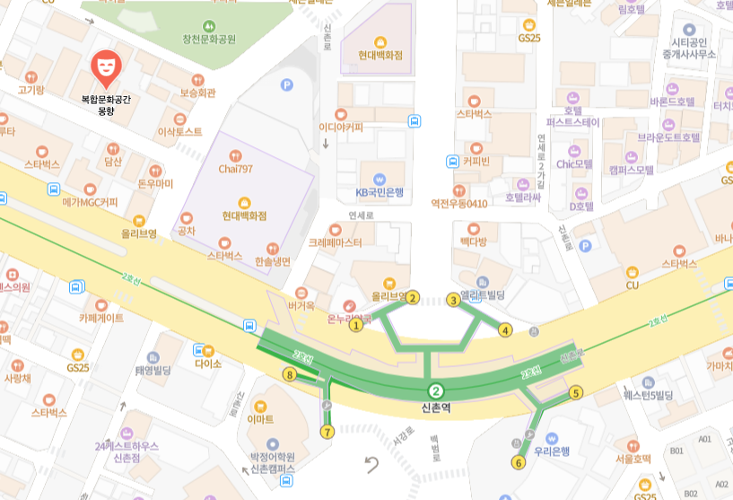 신촌역 1번출구에서 2~3분